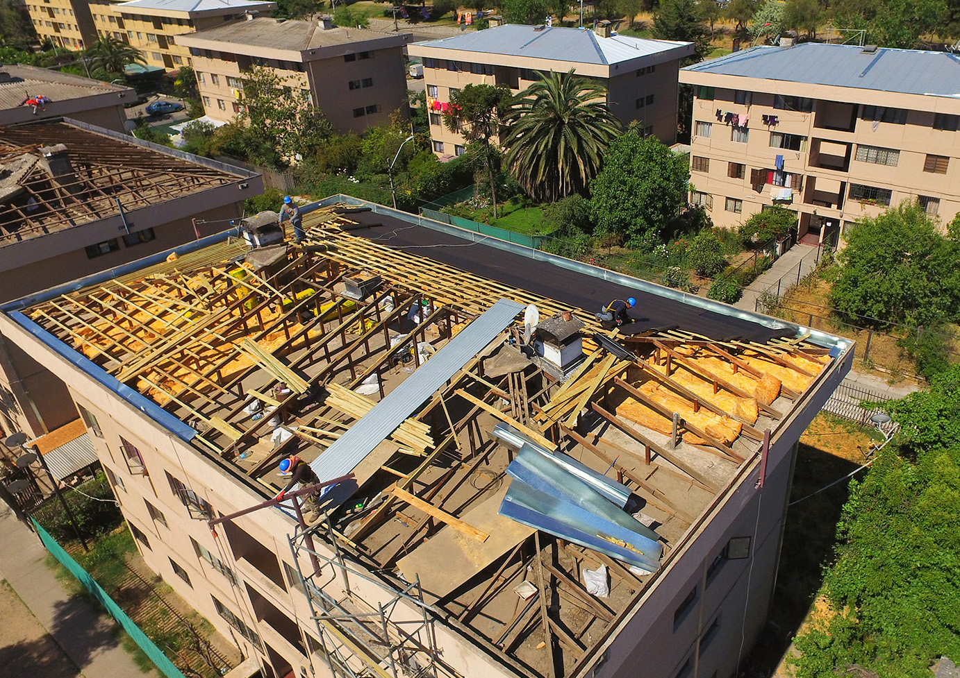 El proyecto contempla la renovación de techumbres, retirando el asbesto, instalando nuevas cubiertas con aislación, y mejorando el sistema de drenaje. Además, se implementará el sistema EIFS en las fachadas, mejorando la eficiencia térmica de los edificios.