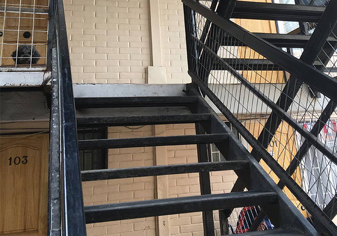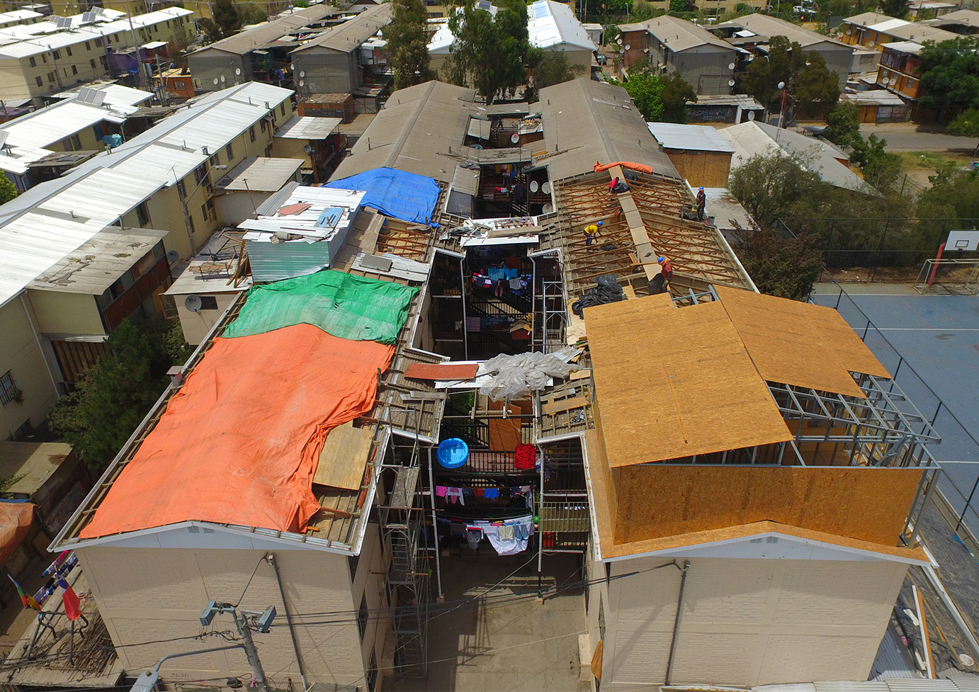 Cada bloque de albañilería confinada, con techos de asbesto cemento y escaleras de acero. El proyecto incluye la retirada del asbesto y el reemplazo de las cubiertas, con aislamiento y ventilación mejoradas. Para prevenir plagas de palomas en los entretechos, se cambiará la lana mineral y se instalarán aleros cerrados.